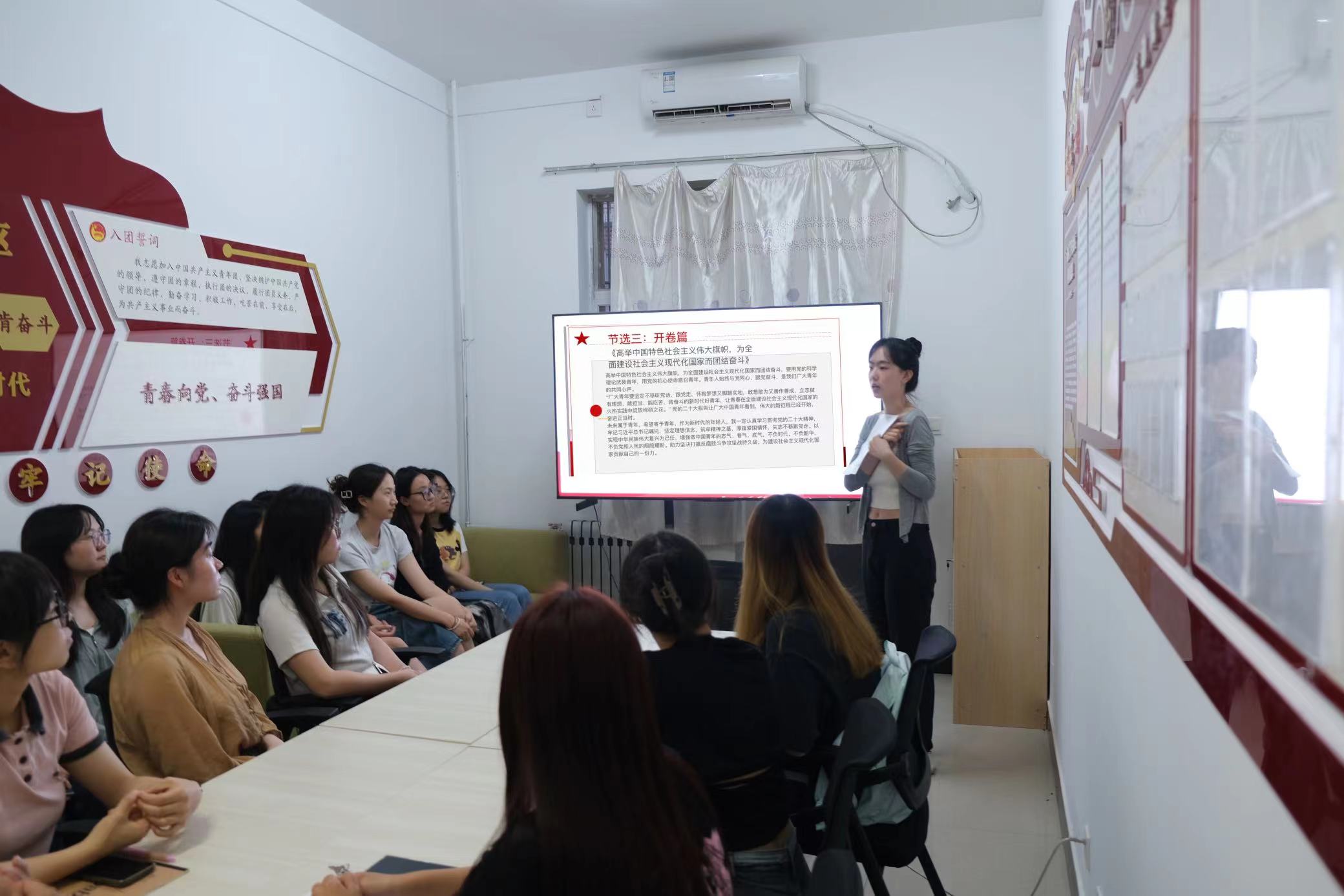 党员杨佳怡首先谈到:《习近平著作选读》生动记录了以习近平同志为核心的党中央领导人民开创中国特色社会主义新时代并不断夺取新胜利的伟大历史进程,集中反映了新时代中国共产党人推进马克思主义中国化时代化取得的重大理论创新成果,是深入学习贯彻习近平新时代中国特色社会主义思想的权威教材。接着,她围绕“以史为鉴、开创未来,埋头苦干、勇毅前行”这一主题进行讲解,引导同学们深刻领悟我们党的初心使命和自信担当,呼吁青年学子把使命扛在肩上,知重负重、苦干实干。宣讲完毕杨佳怡作为优秀推免生,还向同学们分享了自己的个人经历和学习经验,耐心解答同学们的各种困惑。