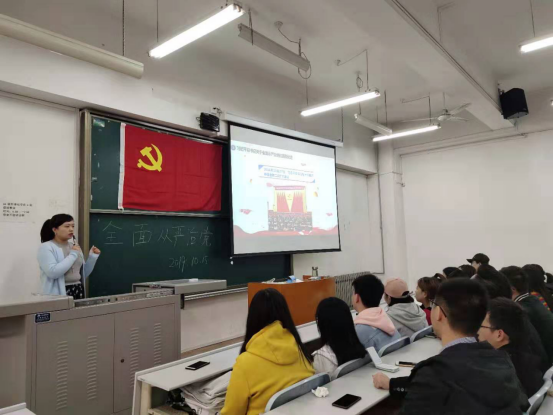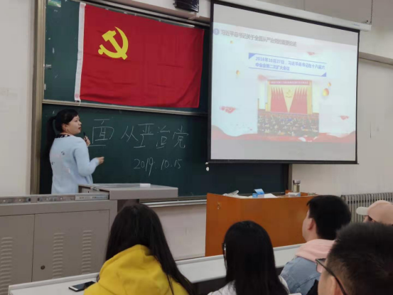 大会开始,李佳璐老师对本学期的党内活动进行部署与安排。随后,做了题为《全面从严治党》的专题党课。李老师讲述了我们为什么要强调从严治党。她分别从历史和现实两个角度对其进行讲解。同时,她强调了在新时代下我们要全面贯彻习近平总书记关于从严治党的方针,努力做好本学期我们的工作。