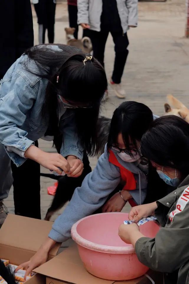 图为各支部志愿者同学们在剥制驱虫药制作流浪动物午餐