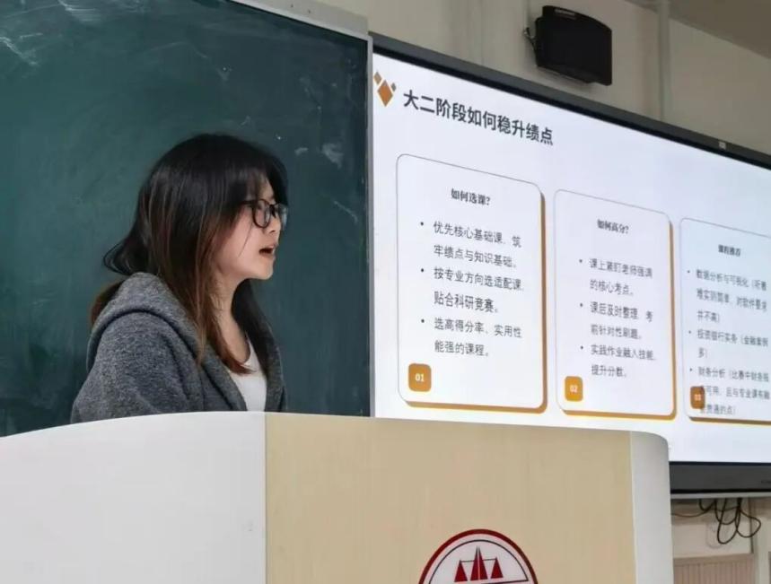王小丫结合“从大一专业第8到大三专业第一”的逆袭轨迹,分享“全能发展”经验,学习提分上强调“细节定成败”,如按时完成作业签到、上课坐前排互动、合理安排不同类型科目复习;竞赛选择推荐“低成本高回报”赛道,如数学竞赛、数学建模、三创赛、大创,建议大一大二多参与文艺体育类活动;学生工作上建议班级优先选班长等职务,社团/组织大一多尝试、大二按需留任,想进编辑部可关注竞争力小的跨专业平台,最后以“抑郁是活在过去,焦虑是活在未来,平静才是活在现在”鼓舞新生沉心走好当下。