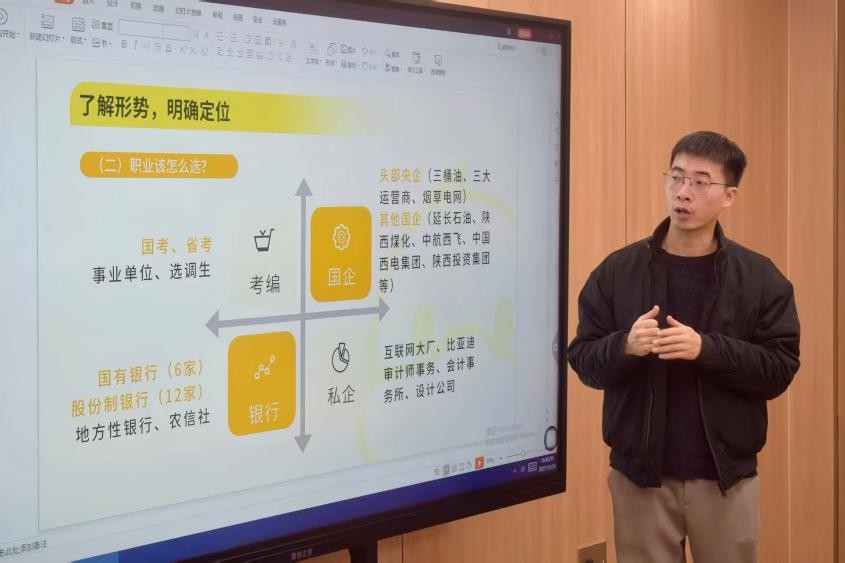 本次讲座紧密围绕生涯规划核心需求,以“了解形势,明确定位”“知己知彼,明确方向”“做出选择,步步为营”三大模块层层展开,为学生搭建系统的职业规划与公考备考框架。