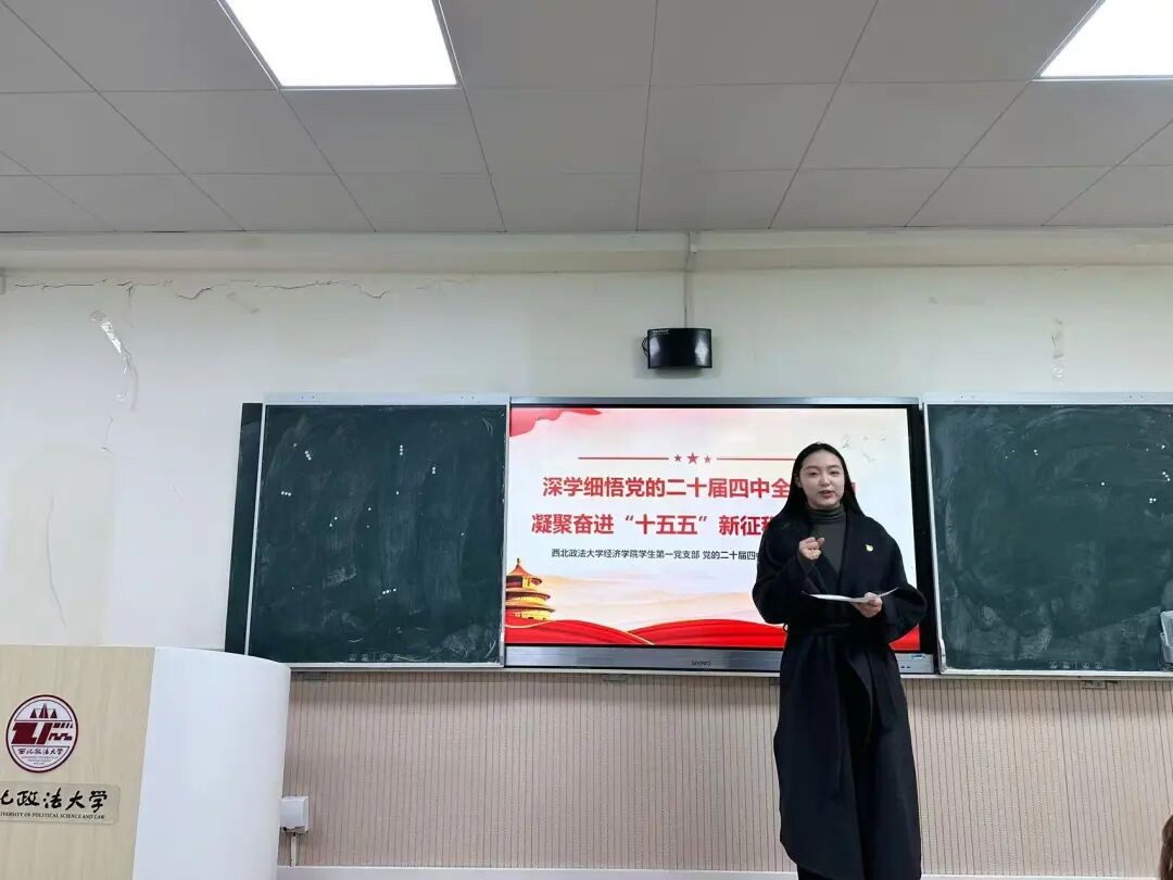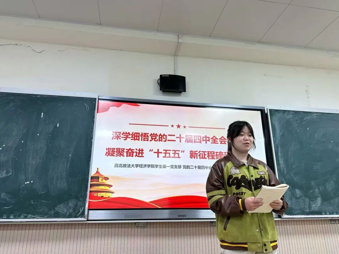 在研讨交流环节,党员们结合经济学科特色、学习科研实际与未来职业规划踊跃发言,畅谈学习感悟。支部党员程婷谈到:“全会强调‘坚持以高质量发展为主题’,作为金融专业学生,我们要深耕专业知识,关注数字经济、绿色金融等新兴领域,努力成为懂经济、善创新的复合型人才,为实体经济高质量发展添砖加瓦。”支部党员景诗涵表示:“全会提出的共同富裕战略部署让我深受触动,未来我将积极参与乡村振兴调研、社区金融知识普及等实践活动,用专业所学助力民生改善,践行党员服务群众的初心使命。”现场研讨氛围热烈,大家在思想碰撞中深化了对全会精神的理解,凝聚了奋进共识。