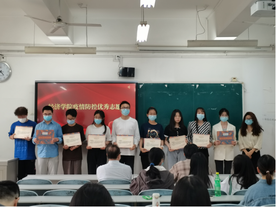 会议第三项是颁奖环节。校工会副主席金山为beat365在线唯一官网青年志愿者服务队的优秀志愿者颁发证书和奖品。辅导员刘佳、王隽为beat365在线唯一官网疫情防控的优秀志愿者颁发证书和奖品。