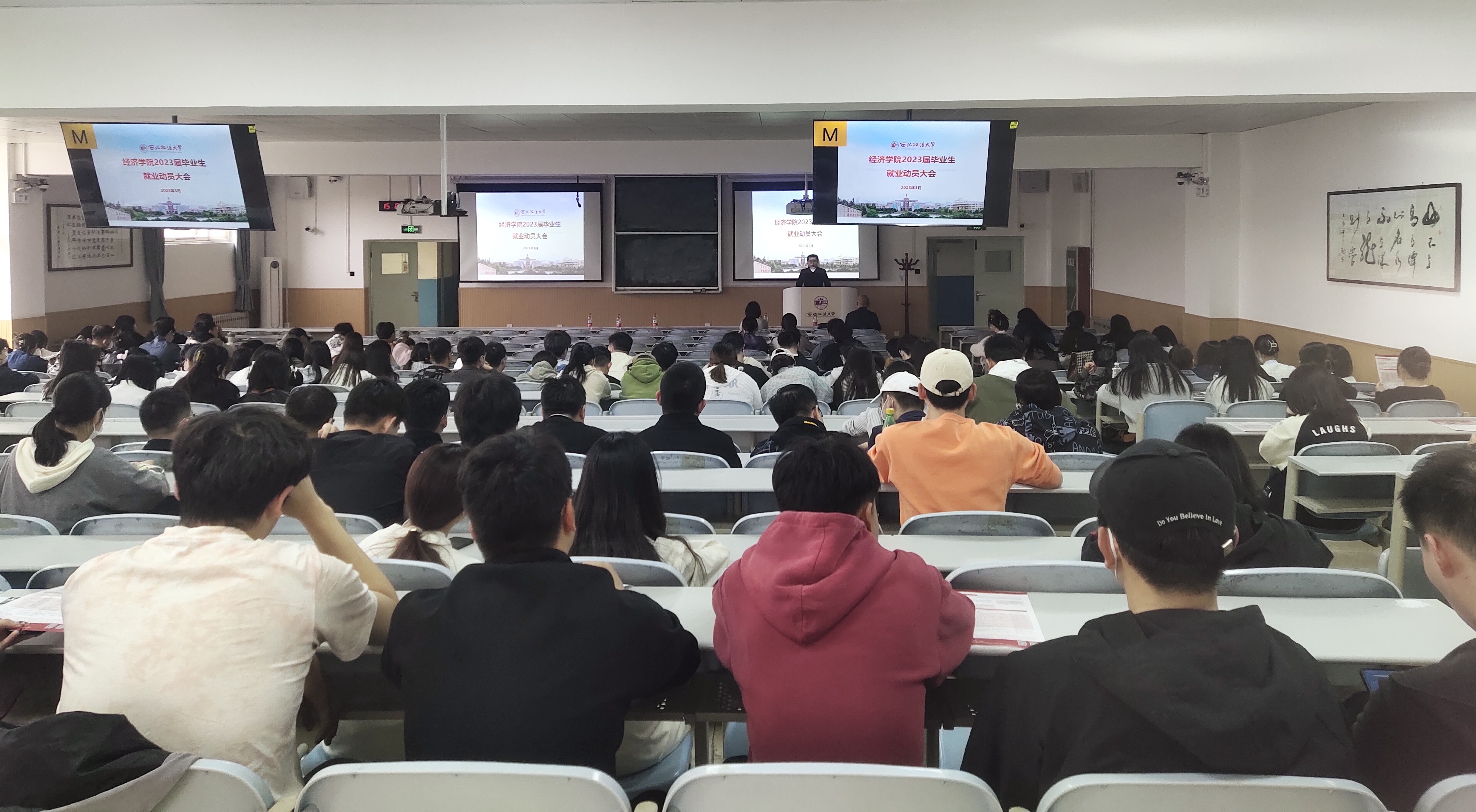 为落实教育部和省教育厅关于“春季促就业攻坚行动”的相关精神和要求,进一步推进毕业生就业工作,引导2023届毕业生紧抓就业机遇、合理规划人生,beat365在线唯一官网于3月15日在长安校区召开了2023届毕业生就业动员大会。学院院长王胜利、党委副书记张文渊,招生就业处杨军,国际交流与合作处武媛媛出席会议,2023届全体在校毕业生及部分2020级在校生代表参加会议。会议由2023届毕业年级辅导员周瑾萱主持。