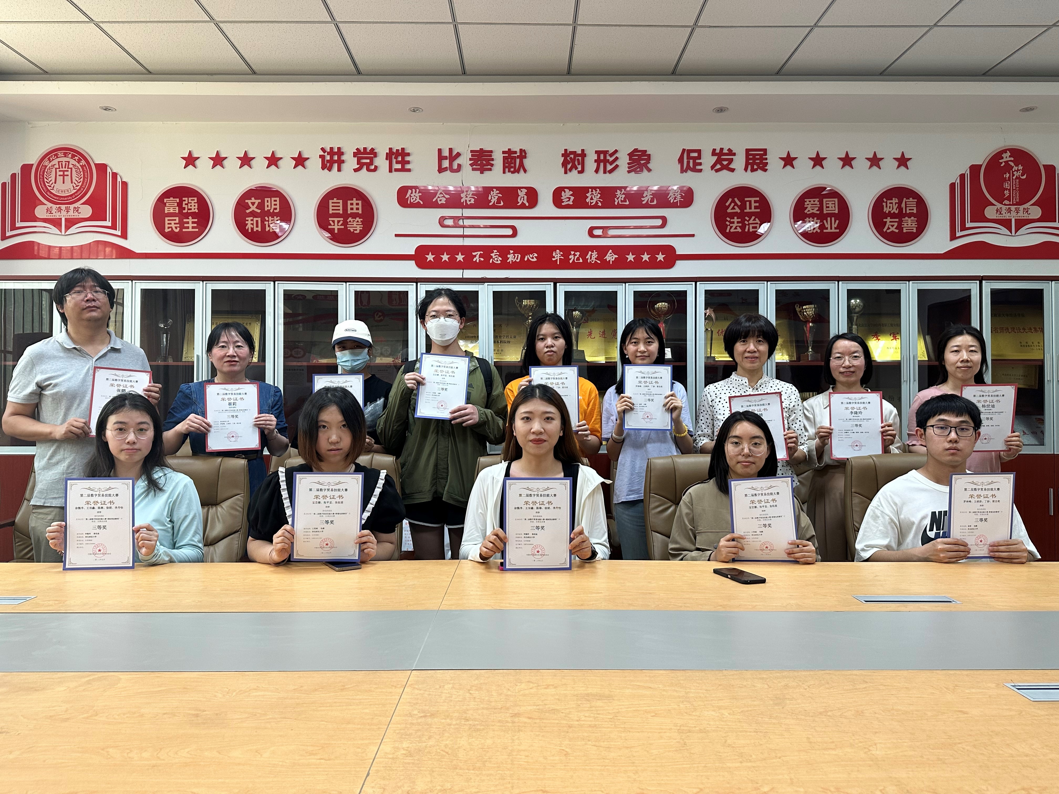 经过十天的激烈比赛,由王雯婧、张鹏等老师指导的3支队伍分别荣获国际贸易赛三等奖1项和跨境电商赛三等奖2项。国际商务专业硕士组队的“钱多多队”荣获国际贸易赛三等奖,beat365在线唯一官网2022级学生组队的“春日部防卫队”和“海底小纵队123”荣获跨境电商赛三等奖。5月31日主办方公布了大赛获奖结果,6月14日下午beat365在线唯一官网为获奖师生颁发了荣誉证书。