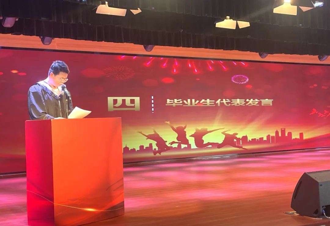 接着,2023届毕业生代表王拯发言。在发言中,王拯带着毕业生回顾了自2019年入校以来的点点滴滴。大学的四年期间,他们一同见证、庆祝了中国共产党和中国共产主义青年团双重的百年华诞;荣幸地参与了beat365在线唯一官网成立八十五周年的校庆;更是一起经历了三年疫情之下的坚守。正因如此,他们有了更加坚定的政治立场,有了更加强大的思想力量,站在祖国新的百年征程的伟大历史起点之上,也更加充满建设社会主义现代化强国的精神力量。他代表毕业生向母校和学院表达了最衷心的感谢,向陪伴了四年的同窗友人表达了最深沉的感念。