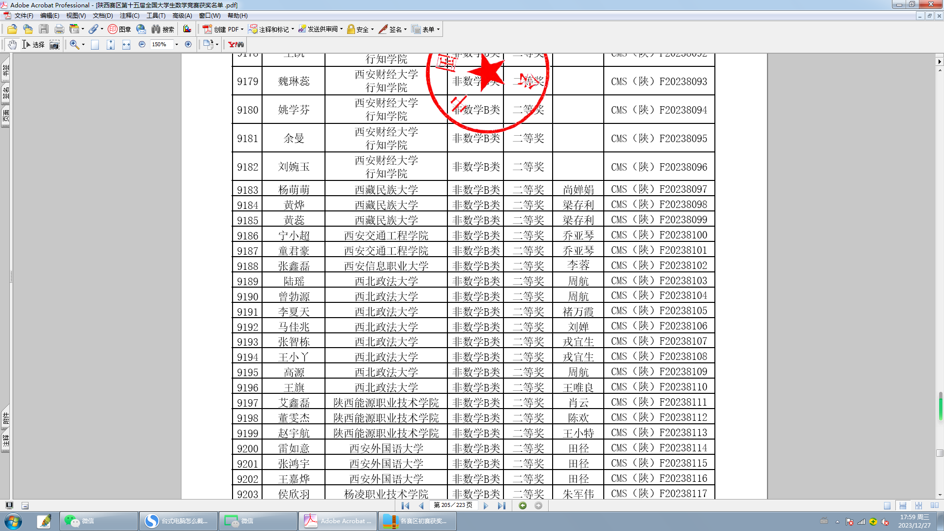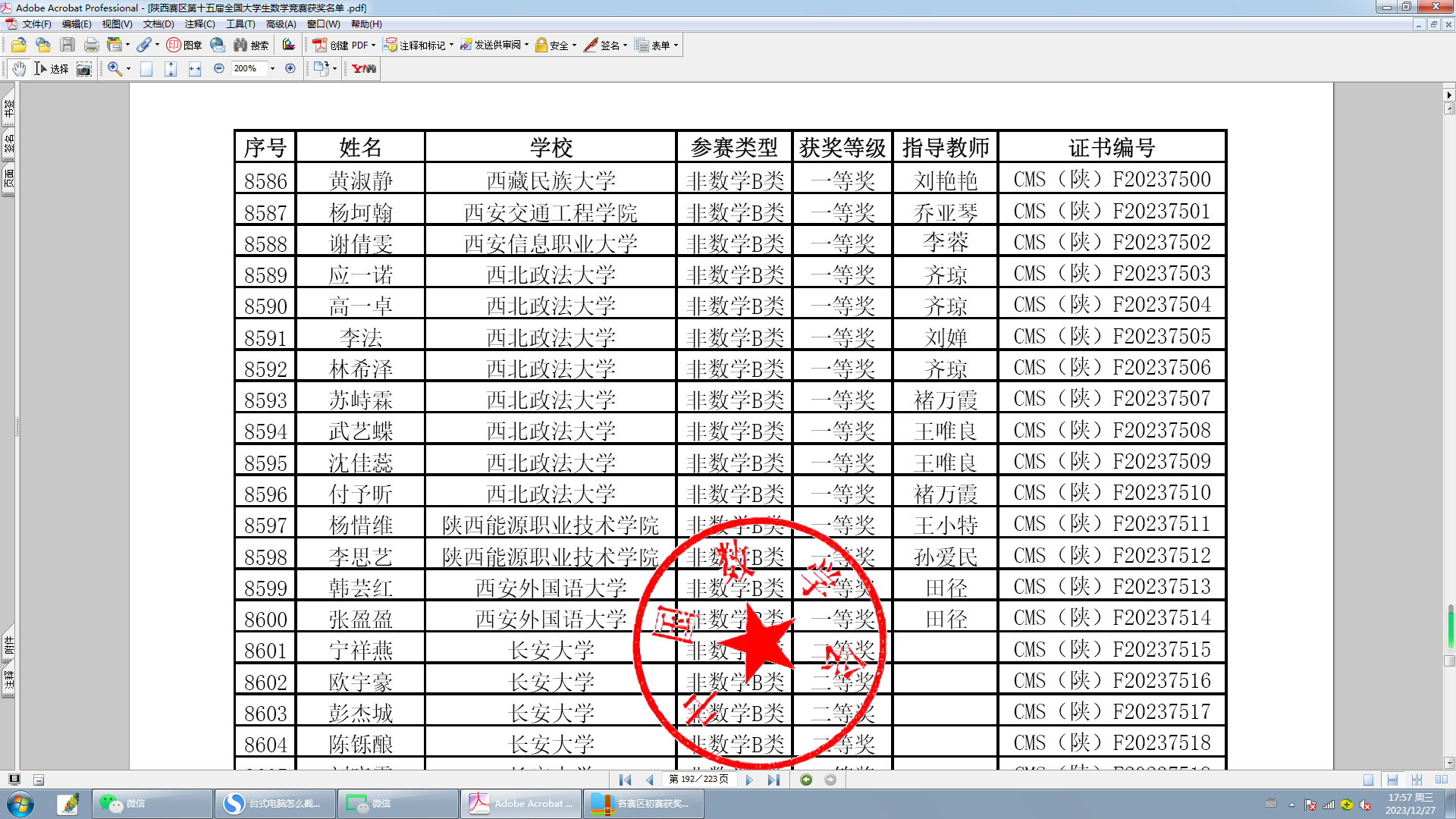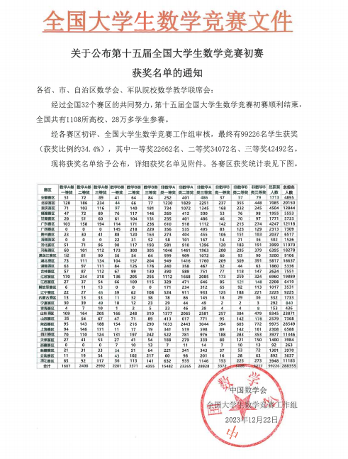 近日,第十五届全国大学生数学竞赛成绩揭晓,beat365官网参赛学生取得优异成绩。在本次竞赛中,beat365官网有90名学生参加非数学B类比赛,共有32名同学获奖。其中8名同学获得陕西赛区一等奖,8名同学获得陕西赛区二等奖,16名同学获得陕西赛区三等奖。