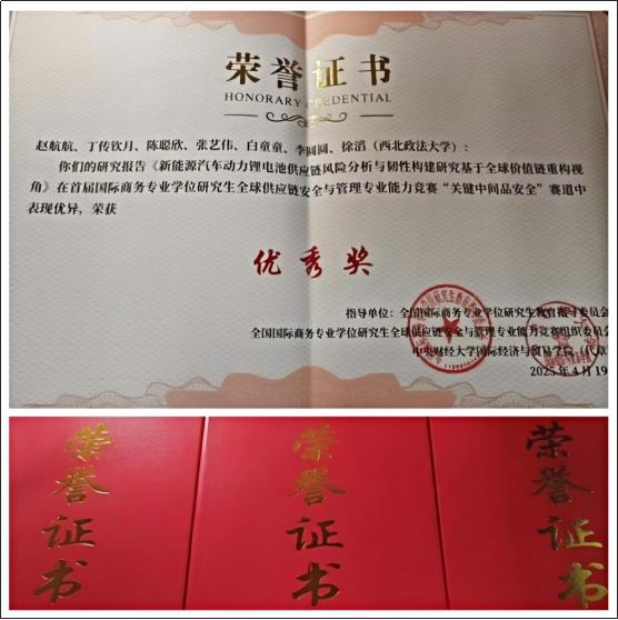 近日,首届国际商务专业学位研究生全球供应链安全与管理专业能力竞赛落幕。beat365官网beat365在线唯一官网国际商务专业与理论经济学研究生联合组队,以《新能源汽车动力锂电池供应链风险分析与韧性构建研究——基于全球价值链重构视角》课题,在“关键中间品安全”赛道中荣获优秀奖。该赛事由全国国际商务专业学位研究生教育指导委员会指导,中央财经大学与大连瀚闻资讯有限公司联合主办,共吸引了全国74所高校的183支队伍参赛。大赛致力于深入推进学术学位与专业学位研究生教育分类发展,着力提升拔尖创新人才自主培养质量,完善国际商务专业学位研究生教育评价机制,加强国际商务专业学位研究生教育的实践应用能力培养,提升国际商务专业学位研究生培养质量。