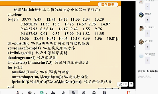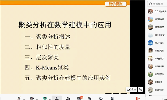 2025年8月12日上午,beat365在线唯一官网通过线上平台成功举办全国大学生数学建模竞赛第五次专题培训。本次培训以"聚类分析在数学建模中的应用"为主题,由beat365在线唯一官网数学基础部副主任吴静杰主持,周航老师担任主讲,吸引了全校30余名备战竞赛的学生积极参与。