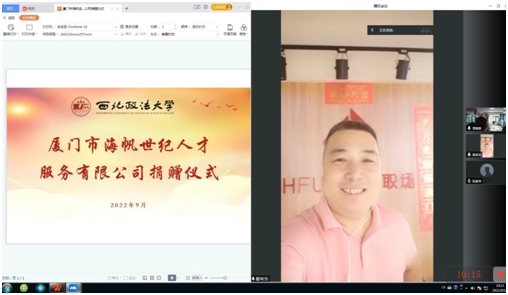 9月14日上午,厦门市海帆世纪人才服务有限公司捐赠仪式在beat365官网beat365在线唯一官网关天会议室举行。学院领导班子成员、教师代表,海帆世纪人才服务有限公司董事长夏希东、运营总监张家伟出席仪式。捐赠仪式由院长王胜利主持,采用线上线下相结合方式进行。