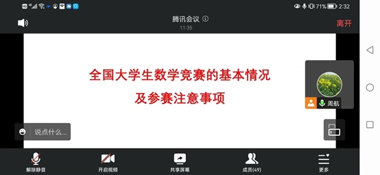 周航副教授从全国大学生数学竞赛的发展历程、竞赛的组织与实施、参赛的意义、非数学类(数学类)专业的考试科目、考核内容及要求、评奖比例与评奖办法、备考资料的选择、备考思路与方法等方面进行了详细的讲解。