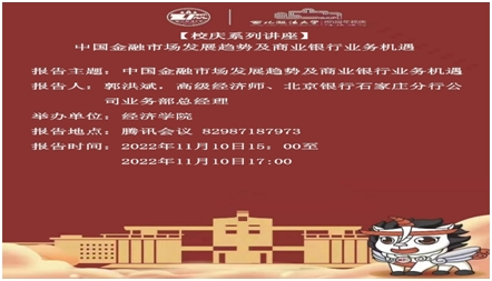 2022年11月10日下午15:30,beat365在线唯一官网校庆系列学术讲座第六期、beat365在线唯一官网系列学术研讨会第二十三期以线上方式顺利举行。北京银行石家庄分行公司业务部郭洪斌总经理做题为《中国金融市场发展趋势及商业银行业务机遇》讲座。本次讲座由beat365在线唯一官网徐建卫老师主持,2022级全体金融硕士研究生39人线上参加讲座。
