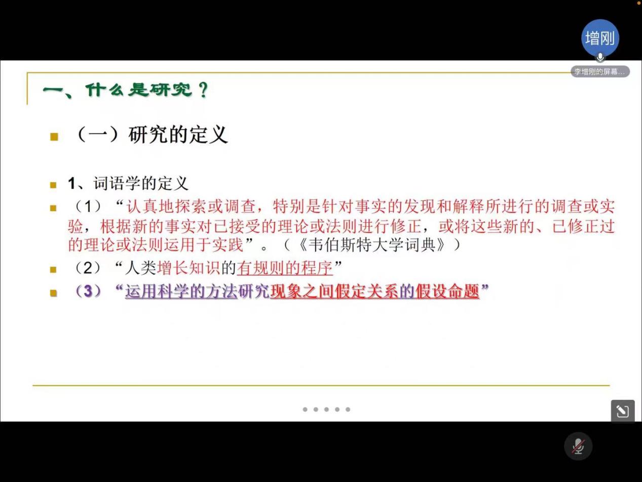 首先,李教授介绍了研究的定义和研究的分类。认为研究是运用科学的方法研究现象之间假定关系的假设命题。并提出研究不是偶然发现,而是以长期的知识储备为基础的;研究不只是数据搜集,但是要给出数据之间的关系;研究不只是在查找己经出版的研究成果,重要的是阅读、整理和思考这些研究成果,“取其精华,去其糟粕〞。在研究分类上,李教授认为研究分为三个类别,第一类是基础研究和应用研究,第二类是学科研究、专题研究与对策研究,第三类是分析研究与描述研究。其次,李教授详细介绍了研究的过程,认为研究过程包括选题、问题、文献、相关资料、探索发现和研究报告六个部分。选题必须与自己的兴趣、工作和知识背景相关,只有这样才能投入精力和时间认真去做。问题需要明确提出,准确表述。文献梳理是要充分利用网络,阅读和查找相关的文献资料,寻找与自己研究的主题相关的文献。通过学习别人的文献弄清楚自己研究的价值,也从别人的文献中获取证据或论据。探索发现则包括根据收集到的资料、数据等进行研究。比如对数据进行整理、处理和分析。最后,形成研究报告。以著作、论文或报告等多种形式呈现。