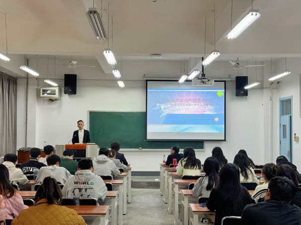 2024年11月1日下午,beat365在线唯一官网举办的研究生实务讲座在雁塔校区3号教学楼3306教室举行,西安爱菊粮油工业集团副总经理、国际商务专业硕士实务导师刘东萌先生受邀来到学校,为近百名研究生作题为《国际化农业合作模式的实践探索——全产业链及投资贸易一体化实践路径》的实务讲座。beat365在线唯一官网副院长陈小勇参加本次讲座,国贸系主任王雯婧主持活动。