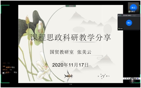 其次,国际经济与贸易系张美云老师也做了课程思政科研教学分享。从两个校级教改项目入手,讲了什么是课程思政、研究进展、教学目标。从《商务谈判》和《国际贸易政策与实务》两门课程的实践讲到了目前课程思政的实施情况和主要结论。最后谈到了自身的三点体会:老教师对新教师的帮扶,思路指导,示范课方面有重要影响,团队合作很重要;要进一步深入实践,关注国家政策,多听精品课程;要具有整体意识和聚焦意识,体现爱国主义,潜移默化影响学生。