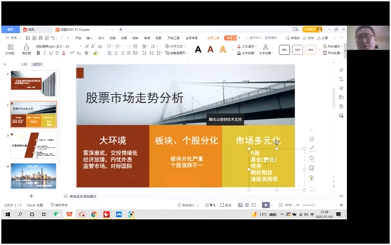 讲座中,王鹤老师从“股票市场走势分析”、“交易策略构建”两个角度对A股市场投资热点与现状进行了介绍,并做了投资策略分析。王鹤老师从大环境、版块、个股以及市场的多元性来分析整体股票市场,建议同学们加强编程能力,对标的股票的选择进行量化操作,提升实务操作水平;王鹤老师还介绍了交易策略的构建方式及交易具体操作策略,阐明金融投资的成效需要建立在持续学习和积累的基础上,鼓励大家不断探索。
