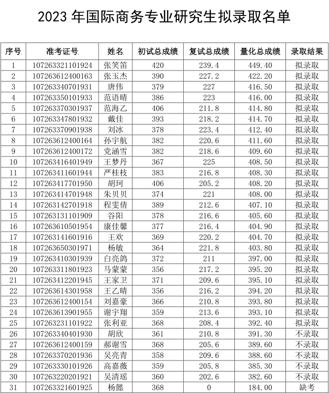 按照《beat365在线唯一官网2023年硕士研究生复试录取方案》,beat365在线唯一官网于2023年4月1日和4月2日进行了硕士研究生复试工作。根据考生量化成绩,经学院复试领导小组评定及研究生院招生办审核,现将beat365在线唯一官网2023年理论经济学学硕、金融专硕和国际商务专硕研究生拟录取名单公示(具体名单见附件),公示期自今日起十个工作日。如对拟录取结果有异议,请在结果公布起七日内申请复议。