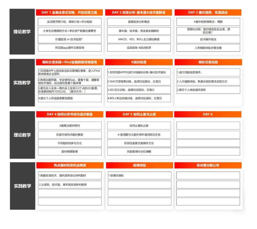 “金融素养提升实训营”活动以实践为核心,结合专业导师的指导和同花顺公司的资源支持,为参与的高校学子提供一系列金融实操培训和行业案例分析,重点指导学生了解金融市场的基本原理和运作机制,讲解投资的基本原理、风险管理策略和投资决策方法。同时,实训营也致力于培养学生的金融素养和金融责任意识,遵守金融法律法规,防范金融风险,保护自身权益。通过全新的教学形式,提供给同学们一个畅游金融殿堂、展现自我风采的机会与平台。