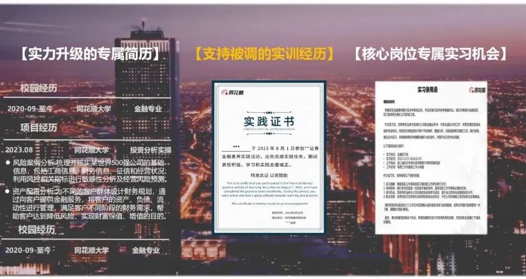 全程参与教学并完成实践任务的同学,将获得由同花顺和证券公司共同颁发的“金融实践证书”,该证书可作为学生求职或升学考研时个人基础能力相关凭证。